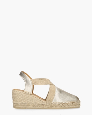 Deze Tossa damessandalen van Cypres stralen zomerse elegantie uit. De upper van goudkleurig leer geeft een luxe uitstraling, terwijl de soepele leren voering en het leren voetbed zorgen voor ultiem draagcomfort. De beige elastische kruisbanden bieden een stevige en flexibele pasvorm. Met de touwzool van circa 6 cm hoogte geniet je van een stijlvolle look en prettig loopcomfort. Kleur: goud. (Platinum)