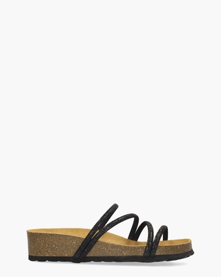 De Tozzy wedgeslipper voor dames van Cypres geeft je zomerse look net dat beetje extra. De leren bandjes over de wreef zijn bezet met fijne zwarte kristalletjes en trekken subtiel de aandacht. Binnenin zorgt de zachte voering voor comfort, terwijl het suède vorgevormde voetbed van kurk prettig aanvoelt en steun geeft. De sleehak is circa 4, 5 cm hoog en de rubberen profielzool biedt grip bij elke stap. Kleur: zwart. (Black)