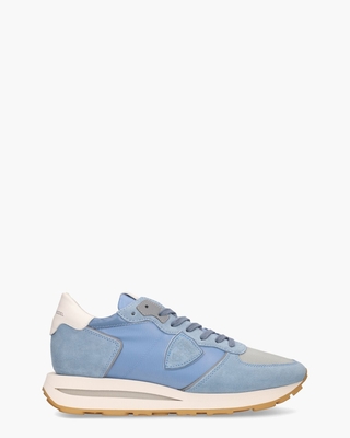 Deze Tropez Haute TKLU-W020 sneakers van Philippe Model vallen op door het gebruik van suède, leer, stof en mesh in verschillende blauwtinten. Op de witte leren hielcap en op de tong prijkt een zilveren PM-logo. De leren binnenvoering met badstof zorgt voor een zacht gevoel en optimaal comfort. Het uitneembare voetbed biedt extra ondersteuning. De lichtblauwe suède zijpatch is een iconisch detail van het label. De driekleurige zool van 2 tot 4 cm hoogte geeft een sportieve look en biedt stevige grip door het grove profiel. Blauwe katoenen veters en grijze lederen accenten maken de herensneakers af. Kleur: lichtblauw. (Bleu Clair) ...