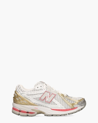 De U1906RCH sneakers van New Balance combineren een futuristische uitstraling met ultiem comfort. Het bovenwerk van synthetisch materiaal en ademend mesh in wit, goud en zilver geeft dit model een strakke en sportieve look. Dankzij de ACTEVA LITE-demping geniet je van optimale ondersteuning, terwijl de lichtgewicht constructie zorgt voor soepel bewegingsgemak. De robuuste multicolor rubberen zool met grof profiel biedt uitstekende grip. Binnenin zorgt de synthetische voering met een uitneembaar voetbed voor extra comfort. Details zoals koraalrode accenten, witte ronde veters, branding en lichtgrijze stoffen lusjes maken het ontwerp compleet. Kleur: wit/goud/zilver/koraalrood. (Silver Metallic/ Dragon Berry/ Gold)