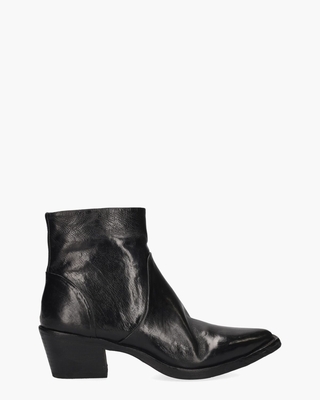 Enkellaarsjes op een spitse leest voor dames model Umay van Vivian Ray. Deze laarzen zijn vervaardigd uit hoogwaardig leer, zowel aan de buiten- als binnenkant en beschikken over een vast voetbed. Het glimmende zwarte leer is met de hand gepoetst en heeft een 'verkreukelde' uitstraling. De circa 13 cm hoge schacht is aan de zijkant voorzien van een ritssluiting. De schuine hak van heeft een hoogte van ongeveer 5, 5 cm. De zool is vintage gehamerd voor een used look. Kleur: zwart. (Black) ...
