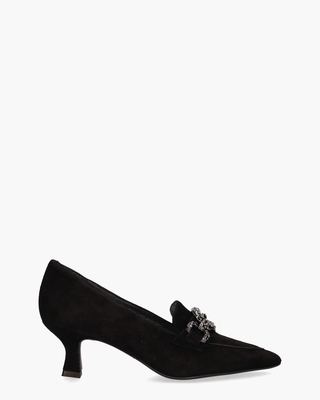Pumps voor dames Venere uit de collectie van Maripé. Dit elegante model op een spitse leest heeft een zwart suède upper. De binnenkant is in leer met een vast voetbed uitgevoerd. De zilveren chain met mini 'kristalletjes' is een echte eyecatcher. Het queeniehakje is bekleed met zwart suède en heeft een hoogte van circa 6 cm. De zool is van rubber gemaakt. Kleur: zwart. (Nero) ...