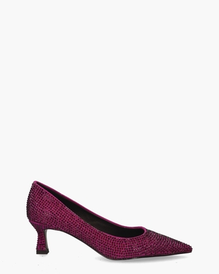 Pumps voor dames Vicky 718Z00VK uit de collectie van Bibi Lou. Dit model heeft een upper van roze/paars suède versierd met donkerpaarse glittersteentjes. De binnenkant is in leer uitgevoerd en heeft een vast voetbed. De pumps hebben een spitse leest. De queeniehak heeft een hoogte van circa 5 cm. De zool is van rubber gemaakt. Kleur: paars. (Morado)