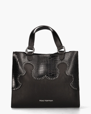 Shopper Vitto uit de collectie van het Spaanse merk Noa Harmon. Deze shopper is vervaardigd van hoogwaardig leer, zowel aan de binnen- als buitenzijde. De binnenzijde van de tas bestaat uit twee compartimenten en beschikt over een handig ritsvakje. De buitenkant van de tas heeft een opvallende (gedeeltelijke) slangenprint en is versierd met studs. Wat deze tas nog specialer maakt, is het kleine bijgeleverde tasje dat je bijvoorbeeld kunt gebruiken als portemonneetje. Bovendien heeft de tas twee handvatten voor extra draaggemak. Het logo siert de voorzijde van de tas, en zilveren hardware voegt de finishing touch toe aan dit model. Afmetingen: hoogte: 27 cm, breedte: 32 cm, diepte: 14.5 cm. Kleur: zwart. (Negro) Mix en match met de bijpassende Noa Harmon Miranda () enkelboots.