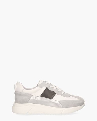 Sneakers voor dames Yasmine 6-A van het merk Miss Behave. Dit colorblock model heeft een bovenwerk van suède en leer in wit en donker- en lichtgrijs met zilverkleurige details. De binnenkant is in leer uitgevoerd en voorzien van een uitneembaar voetbed. Dankzij de chunky rubberen zool van circa 4 cm hoogte lopen de trainers superlekker. Witte veters en een witte stoffen hiellus stylen de dad sneakers af. Kleur: wit/grijs. (White/ Grey)