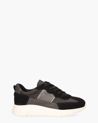 Sneakers voor dames Yasmine 6-B van het merk Miss Behave. Dit colorblock model heeft een bovenwerk van suède en leer in zwart en grijs met zilverkleurige details. De binnenkant is in leer uitgevoerd en voorzien van een uitneembaar voetbed. Dankzij de chunky rubberen zool van circa 4 cm hoogte lopen de trainers superlekker. Zwarte veters en een zwarte stoffen hiellus stylen de dad sneakers af. Kleur: zwart/grijs. (Black/ Multi)