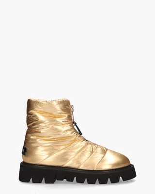 Spacy boots voor dames Yeti 21059200 uit de collectie van Nubikk. Dit model heeft een bovenzijde van gewatteerd doorgestikt nylon. De binnenkant is in leer uitgevoerd en is voorzien van een uitneembaar voetbed. Handig is de rits aan de voorkant van de 18 cm hoge schacht. Op de zwarte rubberen chunky 4 cm lichtgewicht zool en 5 cm hoge hak loop je bovendien superlekker. Merklogo's op het hielstuk en aan het ritslabel maken de golden booties compleet. Kleur: goud. (Gold)