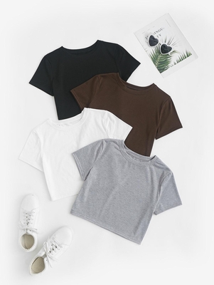 Zaful Style: Basic Occasions: Daily Shirt Length: Crop Top Collar: Round Collar Sleeves Length: Short Sleeves Fit Type: Slim Material: Cotton, Polyester, Spandex Material Stretch: Slight Stretch Pattern Type: Solid Seasons: Spring, Summer Weight: 0.3500kg Package: 4 x Tees