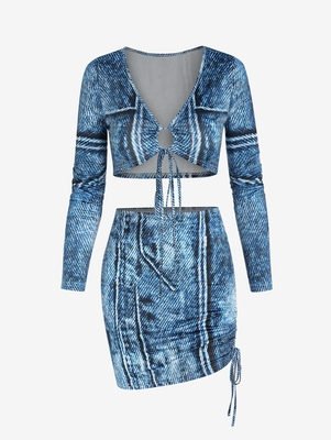 Abstract Print Cinched Cropped Top And Skirt Set L Deep Blue
