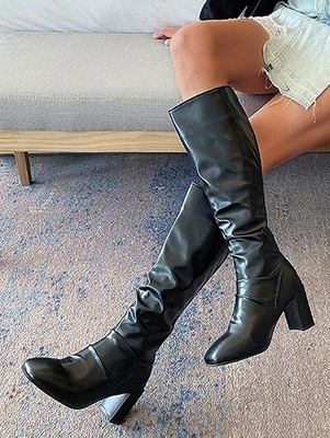 Zaful Gender: For Women Boot Type: Riding Boots Style: Fashion, Vintage Occasion: Daily Boot Height: Knee-High Toe Shape: Pointed Toe Heel Type: Chunky Heel Closure Type: Zip Pattern Type: Solid Color Outsole Material: Rubber Upper Material: PU Lining Material: PU Season: Fall, Winter Weight: 1.3398k