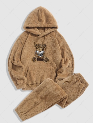 Bear Pattern Pullover Fluffy Teddy Hoodie And Beam Feet Pants Set