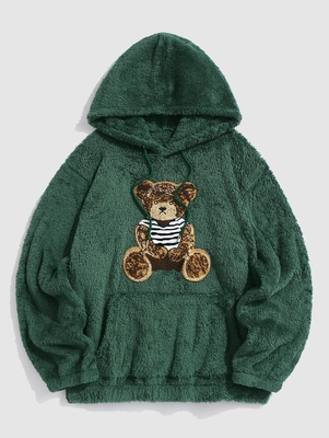 Bear Terry Embroidered Pullover Fluffy Teddy Hoodie S Deep Green