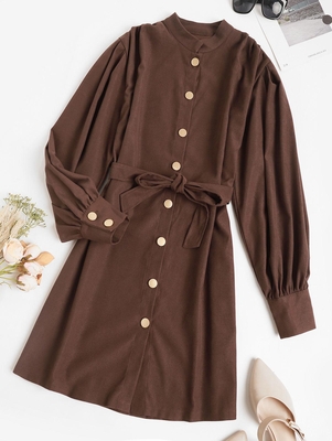 Zaful An effortless off-duty look. Designed with exaggerated balloon-sleeved proportions, this classic shirt dress is dressed up with a matching self-tie belt to define the flattering silhouette. Style: Casual Occasion: Daily Silhouette: Shift Collar-line: Stand Sleeve Type: Balloon Sleeve Sleeves