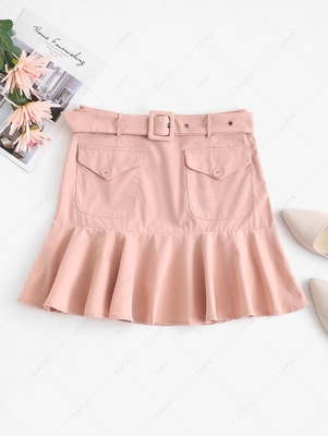 Zaful Add some cute vibes to your look with this mini skirt. Featuring flap pockets, a flowing flounce hem, and a buckle belt, team this skirt with a crop top for a classy look we're loving. Style: Cute Occasions: Daily, Going Out Material: Polyester Length: Mini Silhouette: A-Line Pattern Type: Sol