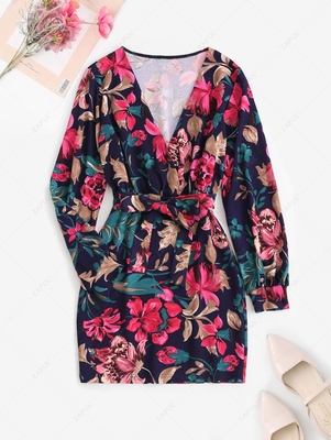 Zaful Featuring a classic surplice-style silhouette with a matching self-tie belt & covered with a bold, retro floral print, this long sleeve mini dress is a charming one-&-done outfit that'll go from day to night with ease. Style: Brief Occasion: Vacation Dress Type: Surplice Dress Silhouette: