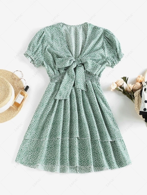 Zaful Get ready for that upcoming vacay with this dress. Featuring an all-over tiny print, a chic V collarline with a lovely bowknot tie, an elastic-smocked waist, and a layered design, we're obsessed. Team this with heels and a shoulder bag to complete the look. Style: Cottagecore Occasion: Daily,