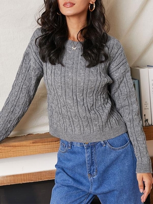 Cable Knit Drop Shoulder Solid Sweater S Gray