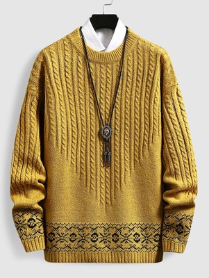 Cable Knit Graphic Crew Neck Sweater M Yellow