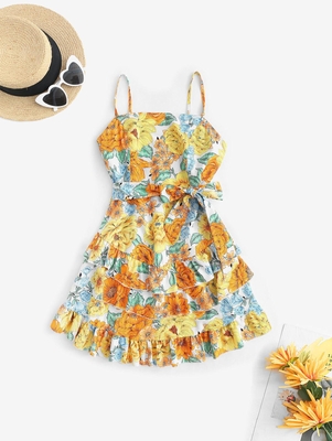 Zaful Style: Cute Occasion: Daily, Vacation Dress Type: Sundress Silhouette: A-Line Collar-line: Spaghetti Strap Sleeves Length: Sleeveless Dresses Length: Mini Material: Polyester Material Stretch: No Stretch Pattern Type: Floral Decoration: Adjustable Shoulder Strap, Layered, Ruffles, Sashes Waist: H