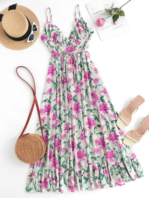 Zaful A dazzling, romantic floral pattern draws the eye to this elevated cami midi dress, while a self-tie waist adds a tidy touch. To complete your outfit, go with heeled sandals & gold-tone jewelry. Style: Cute Occasion: Daily, Vacation