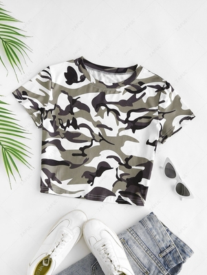 Zaful Add a little edge to your off-duty look with this crop top. Featuring a unique camouflage pattern with short sleeves, we're in love. Wear with mom jeans & fresh kicks for an effortlessly on-point vibe. Style: Casual Occasions: Daily Shirt Length: Crop Top Collar: Round Collar Sleeves Length