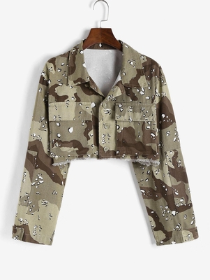 Camouflage Print Raw Hem Pockets Cropped Jacket L Multi A