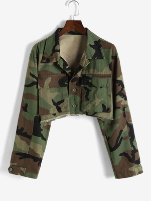Camouflage Print Raw Hem Pockets Cropped Jacket L Multi B