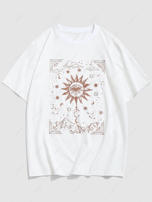 Zaful Presenting the celestial sun moon and eye graphic print, the short-sleeved t-shirt is a refreshing addition to streetwear portfolios. The piece with a classic comfy-fit silhouette offers a touch of casual to the garment. Pull it on with your collections for a perfectly relaxed outfit. Style: