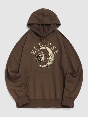 Celestial Sun Moon Letters Print Graphic Hoodie M Deep Coffee