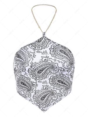 Zaful Decorated with a seventies-inspired paisley print, this bandana top features a chain halter collar, a pointed hem, & dual self-tie knots fastening at the back. Style: Sexy Shirt Length: Crop Top Collar: Halter Collar