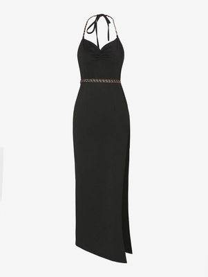 Zaful Style: Sexy Occasion: Date Night Silhouette: Sheath Collar-line: Halter Sleeves Length: Sleeveless Dresses Length: Midi Material: Polyester, Spandex Material Stretch: Slight Stretch Pattern Type: Solid Decoration: Backless, Chains, Slit Season: Fall, Spring, Summer With Belt: No Weight: 0.3600kg P