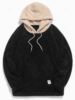 Colorblock Splicing Drawstring Fluffy Fleece Hoodie L Black