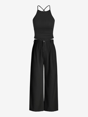 Zaful Occasion: Daily, Date Night Style: Cute, Sexy Fit Type: Regular Collar-line: Spaghetti Straps Sleeves Length: Sleeveless Bottom type: Wide Leg Pants Bottom Length: Normal Waist Type: Mid Closure Type: Zipper Fly