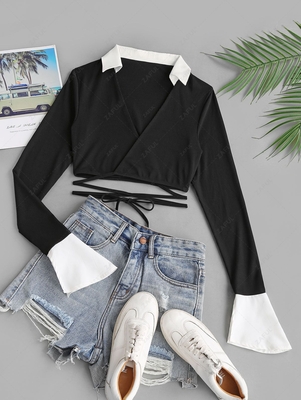 Zaful Tying up at the waist the fastening gives off a plunging V collarline, this crop top is whipped up in ribbed textured fabric and fitted with contrasting collared and cuffs. Style: Fashion Occasions: Daily Shirt Length: Crop Top Collar: V-Collar Sleeves Length: Long Sleeves Fit Type: Slim Mate