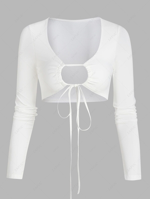 Zaful More than just a simple cropped tee, this long-sleeved tee feels unique with a drawcord tie with a creative cutout at the bodice. Wear it with light-wash denim & understated sandals to complete your off-duty look. Style: Cute Occasions: Daily Shirt Length: Crop Top Collar: Scoop Collar Slee