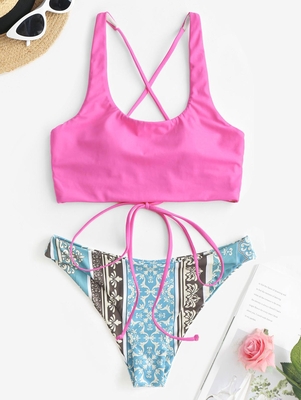 Zaful Style: Cute, Fashion Swimwear Type: Bikini Set Bikini Type: Cheeky Bikini, High Cut Bikini Gender: For Women Material: Nylon, Polyester, Spandex Material Stretch: Slight Stretch Bra Style: Padded Support Type: Wire Free Collar-line: U Collar Pattern Type: Print Decoration: Criss-Cross, High Cut Wa