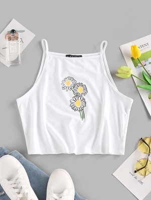 Zaful This camisole featuring a vibrant daisy pattern has a cropped length that matches well with high-waisted bottoms for a figure-flattering look. Style: Casual Shirt Length: Crop Top Collar: Spaghetti Strap