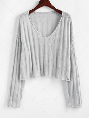 Zaful A wavy,  scalloped hem with a touch of distressing lends a uniquely worn-in look to this casual v-collar sweater,  which is knit with classic,  wife ribbed fabric. Type: Pullovers Style: Cute Fit Type: Loose Length: Short Collar: V-Collar Sleeve Type: Drop Shoulder Sleeves Length: Full