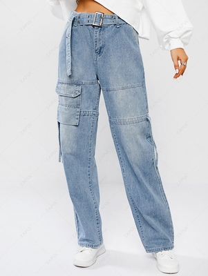 Zaful Adjustable drawstrings upon the knees add to the modern chics of these non-stretch straight jeans topped with topstitching details offering some lengthening effects, a utility cargo pocket, & a high waist with a belt to shape the look. Style: Boyfriend