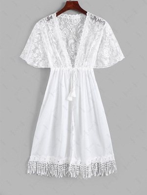 Zaful Get your beach look on-point with this cover-up. Featuring a flower-patterned lace insert, a drawstring tie waist with tassels, & a fringed hem, style it with a basic bikini for the ultimate poolside look. Cover-Up Type: Top Gender: For Women Length: Longline Collar-line: Plunging Collar Sl