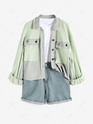 Material: Cotton Material Stretch: No Stretch Length: Short Sleeves Length: Long Sleeves Sleeve Type: Drop Shoulder Collar: Turn-down Collar Closure Type: Single Breasted Pattern Type: Colorblock Decoration: Frayed, Pockets With Belt: No Seasons: Fall Weight: 0.5