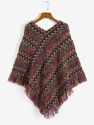 Ethnic Zig Zag Fringed Trim Poncho Sweater L Multi B