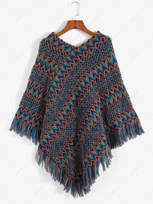 Ethnic Zig Zag Fringed Trim Poncho Sweater M