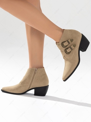 Height: Ankle Toe Shape: Pointed Toe Heel Type: Chunky Heel Closure Type: Zip Pattern Type: Others Decoration: Buckle Outsole