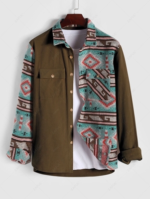 Material: Polyester Material Type: Corduroy Material Stretch: No Stretch Collar: Turn-down Collar Shirt Length: Regular Sleeves Length: Long Sleeves Fit Type: Regular Fit Pattern Type: Ethnic Print Decoration: Pocket, Spliced Season: