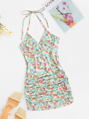 Zaful Oil-painting floral covers this curve-hugging mini dress designed with rippled ruches for extra sophistication, a flattering surplice front, an empire waist, & an adjustable halter collar to make for a just-right fit. Style: Fashion, Sexy Occasion: Day, Vacation Silhouette: Bodycon Collar-lin