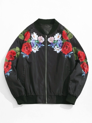 Flower Pattern Print Zip Up Bomber Jacket 2xl Black