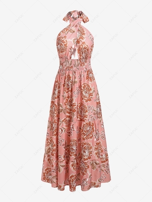 Zaful Style: Cottagecore Occasion: Daily, Vacation Silhouette: A-Line Collar-line: Halter Sleeves Length: Sleeveless Dresses Length: Maxi Material: Polyester, Spandex Material Stretch: No Stretch Pattern Type: Floral Decoration: Backless, Criss-Cross Waist: High Season: Fall, Spring, Summer With Belt: N