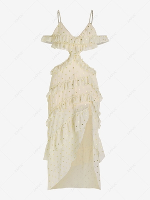 Foil Polka Dot Ruffles Cutout Slit Maxi Dress M Light Yellow
