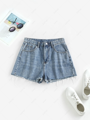 Material: Cotton, Polyester Length: Mini Fit Type: Regular Waist Type: High Closure Type: Zipper Fly Front Style: Flat Pattern Type: Solid Decoration: Frayed, Pockets Thickness: Standard Wash: Medium Wash Material Stretch: No Stretch With Belt: No Seasons: Summer